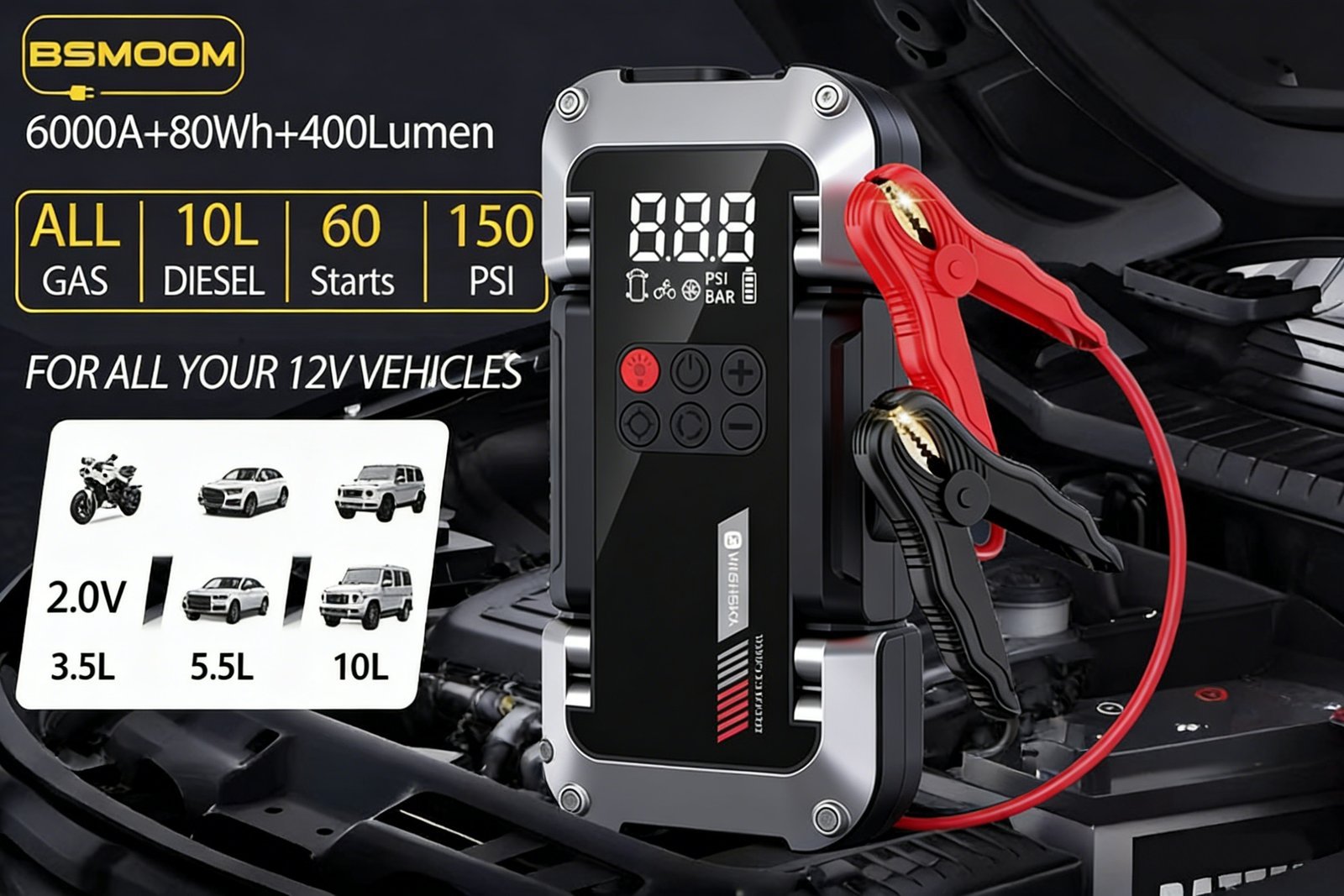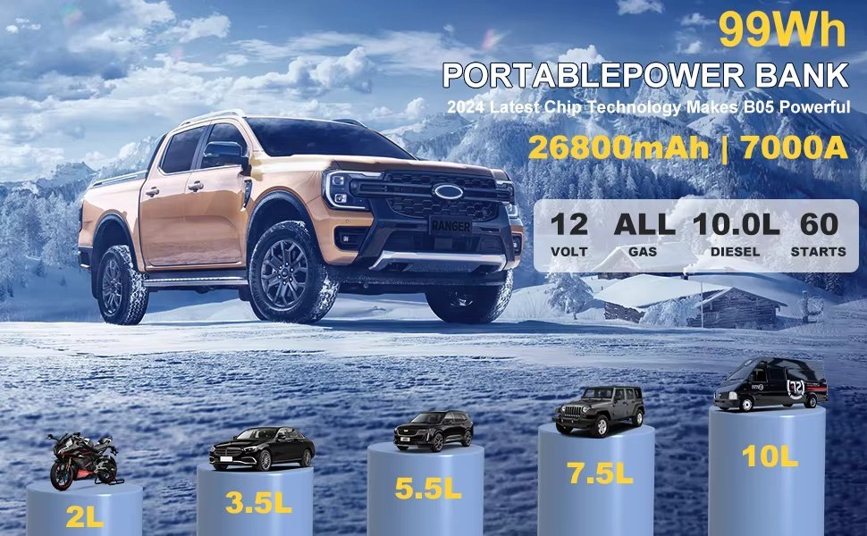 Arranca motores de gasolina hasta 10L y di¨¦sel hasta 8L, versatilidad total para todo tipo de veh¨ªculos.